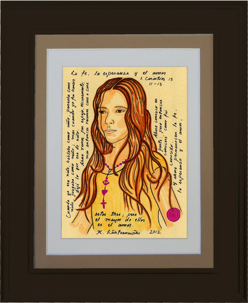 "Blue ribbon, nro 1". Akryyli ja tussi kartongille.